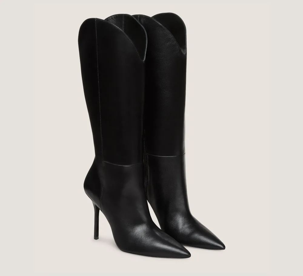With the STUART OUTRIDER 100 BOOT, we reworked our iconic STUART boot design with a modern, Western-inspired twist. This structured knee-high style features curved cuffs that offer a flattering, leg-lengthening effect. Meanwhile, its sharply pointed toe and sleek 100-mm stiletto heel showcase the precise craftsmanship of our artisans in Spain.
