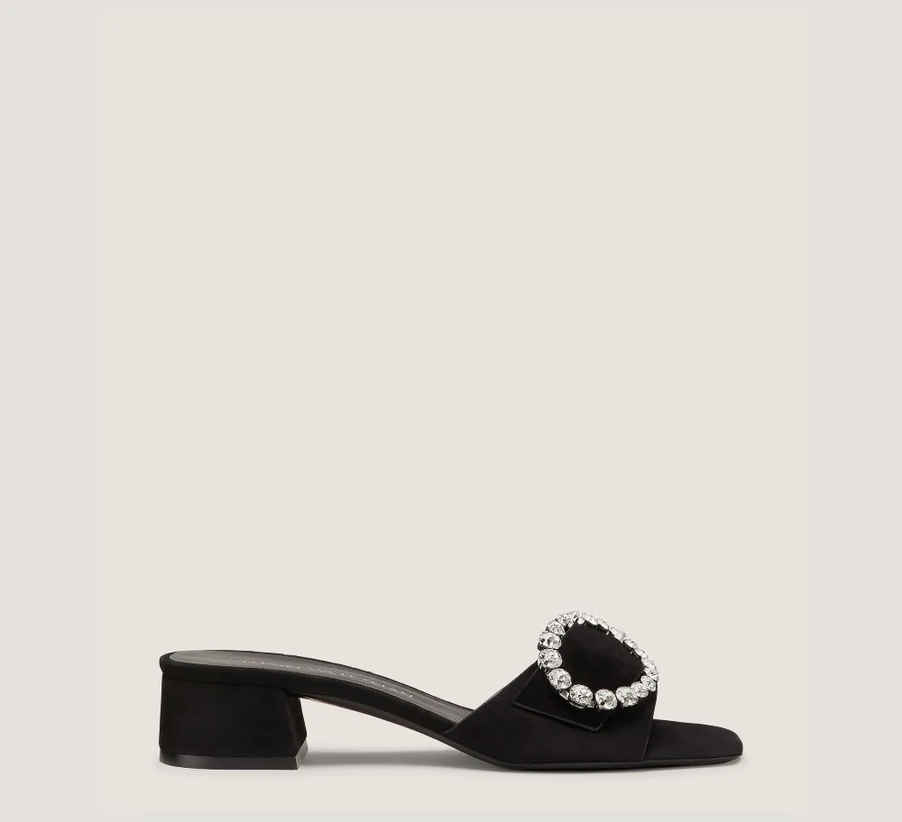 The SLOANE 35 SLIDE is definitively glamorous — without even trying. This silhouette is crafted by SW artisans in Spain with a luxe crystal-embellished buckle and set on a low, 35-mm block heel. A modern square toe further imparts polish to the look.