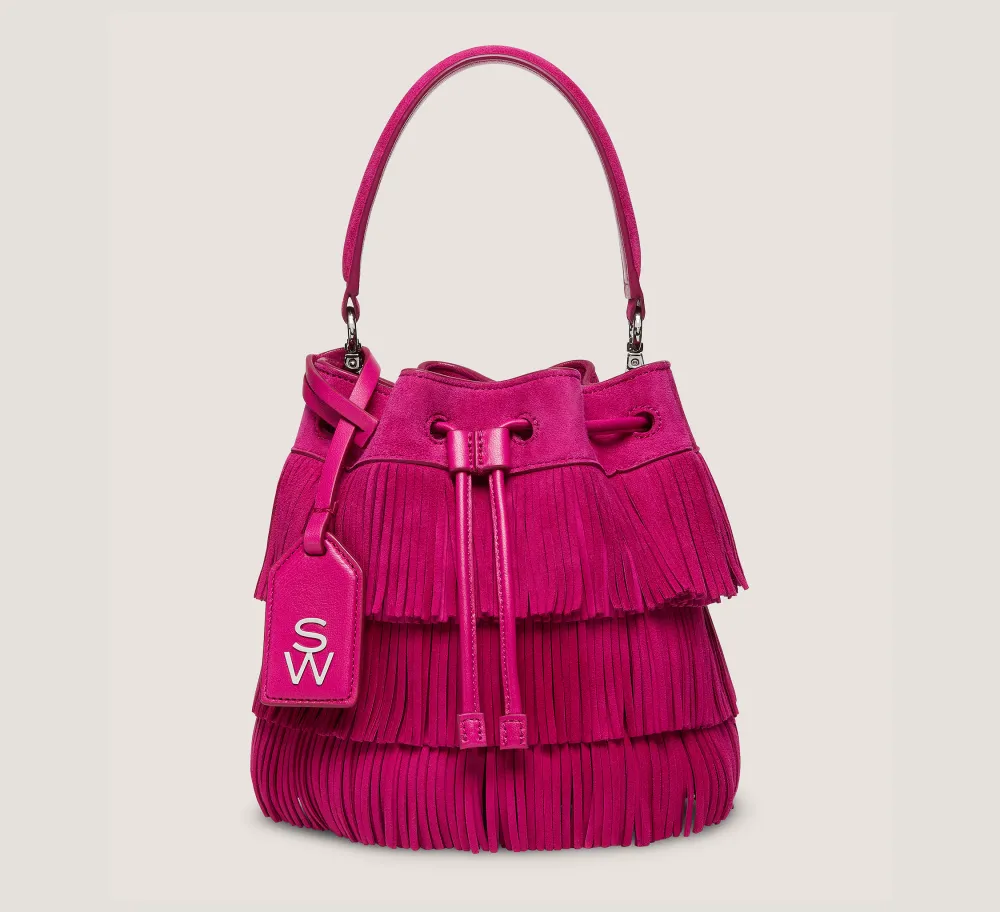 Intricate fringe details make the RAE FRINGE MINI BUCKET BAG a true fashion statement. Crafted by our artisans in Italy with an equal focus on style and functionality, this drawstring-closure bag is sized to fit your smartphone, wallet keys and more. Its top handle enables it to be worn on the nook of your arm, and its adjustable shoulder strap — complete with chain accents — enables it to be slung on your shoulder or worn as a crossbody bag.