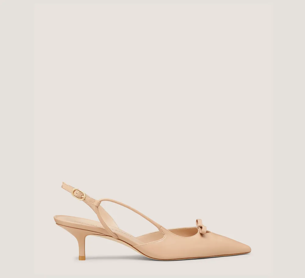 The TULLY 50 SLINGBACK embodies timeless femininity. Elegant details set this look apart, from its subtle cutout vamp detail, which is accented by a bow adornment, to its strappy cutout side design. Crafted by SW artisans in Spain, it is finished with a sculptural 50-mm kitten heel that imparts just the right amount of lift without sacrificing comfort.