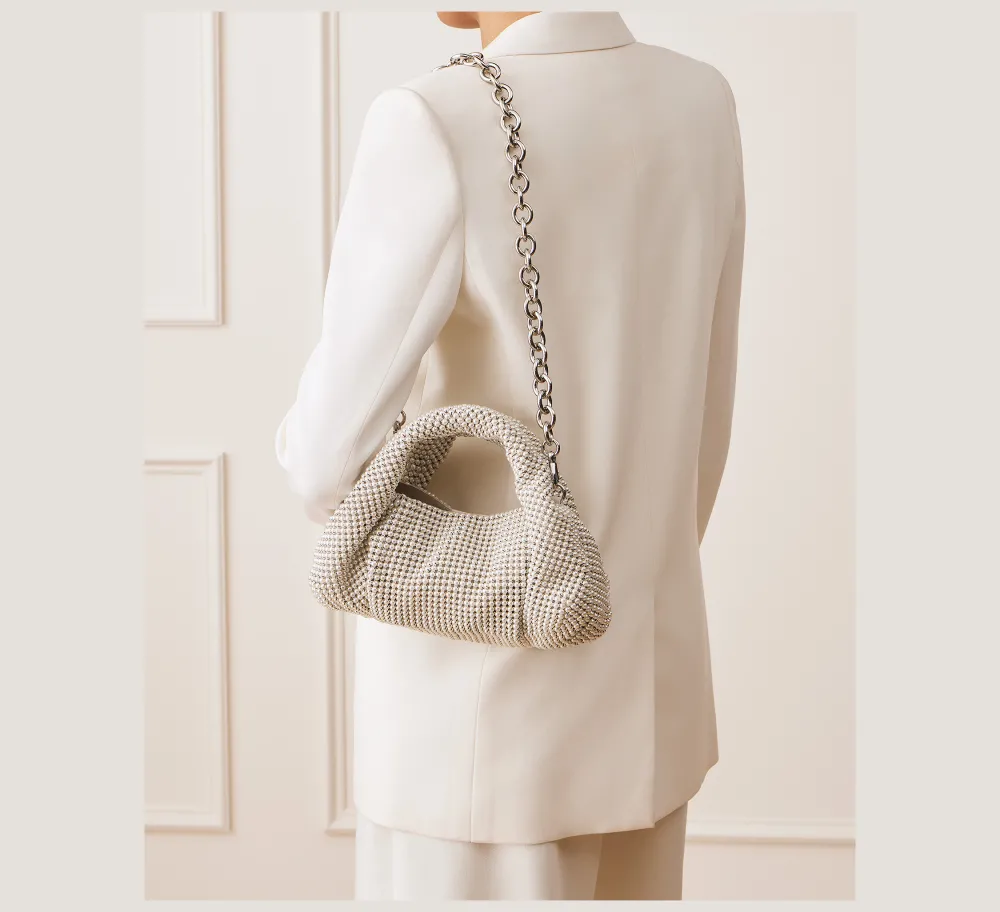The MODA PEARL MINI TOTE delivers a timelessly glamorous twist on our best-selling party-ready MODA handbag design. Crafted by our artisans in Italy from an intricate pearl-adorned mesh material, this look is definitively luxe. It features a softly structured silhouette with subtle draping that further sets it apart and opens to reveal a surprisingly spacious interior that fits everything you need for your next special occasion. Wear it as a shoulder bag using its detachable chain strap or as a compact top handle depending on your look.