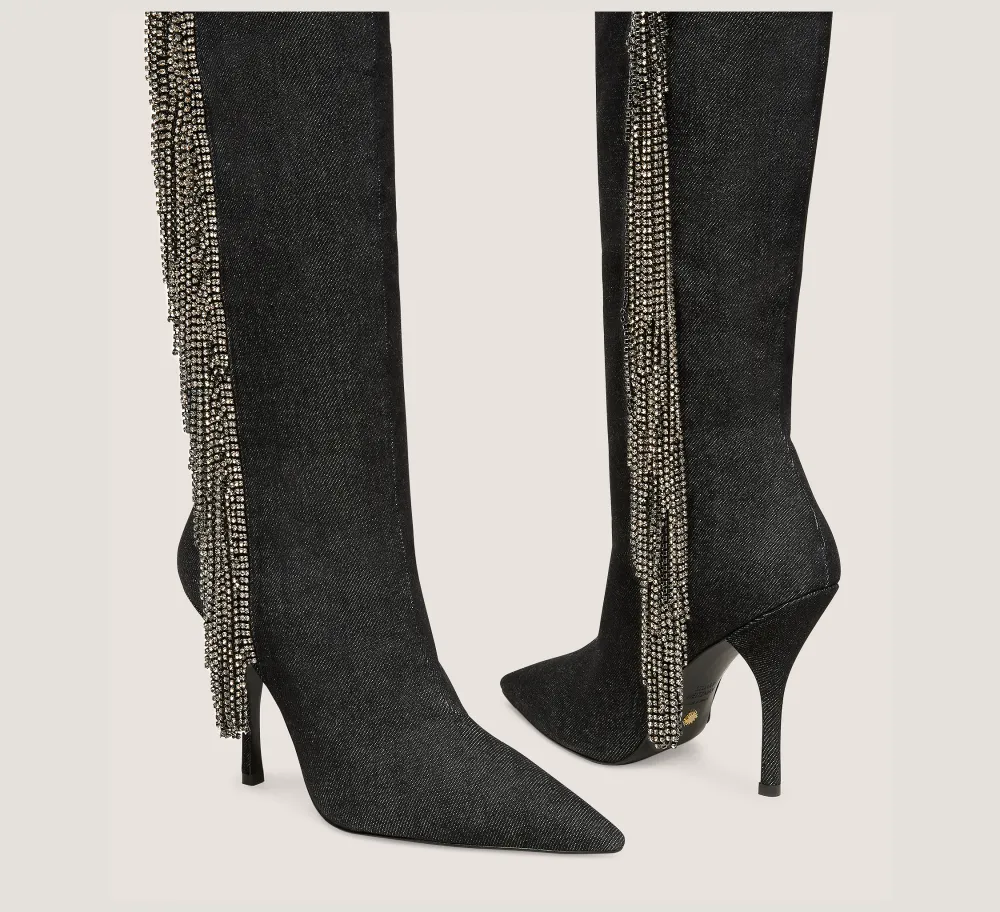 Dial up the glamour in the CRYSTAL FRINGE BOOT. Defined by a hand-stitched, cascading fringe accent adorned with approximately 7,500 crystals per pair, this eye-catching knee-high boot is designed to turn heads with every step. It is crafted by SW artisans in Spain on a curved, 100-mm stiletto heel that is specially engineered for extra support and finished with a concealed side zipper for accessibility.